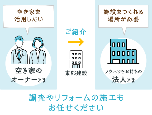 これまでの福祉施設の実績を活かしてご利用者さまの特性に合わせたリフォームの施工もあわせて行うことができますので、空き家活用をご検討の際には、是非お気軽にご相談ください。